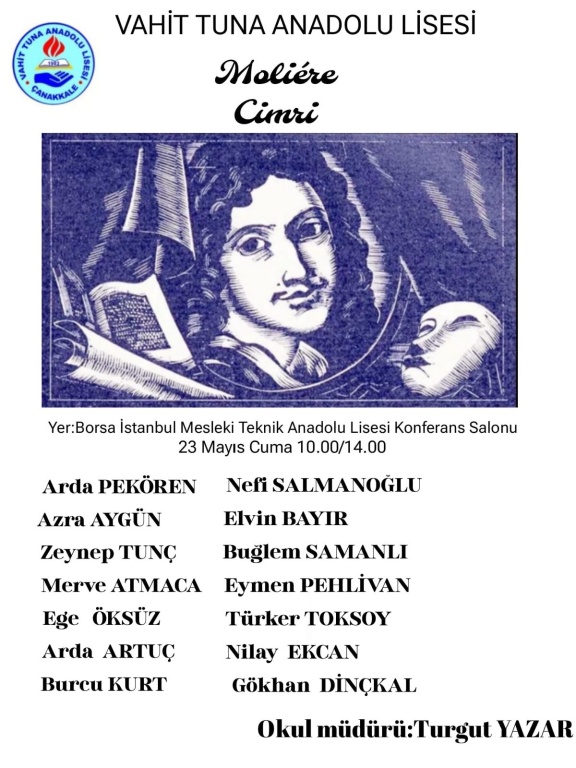 Okulumuz Türk dili ve edebiyatı öğretmeni Gülnur KESKİNKILIÇ'ın koordinesinde hazırlanan Molière'den "Cimri" Oyunu, 23 Mayıs Cuma günü Borsa istanbul Mesleki Teknik Anadolu Lisesi konferans salonunda izleyicilerle buluştu. Beğeniyle izlenen oyunda görev alan öğretmen ve öğrencilerimizi tebrik ediyoruz.